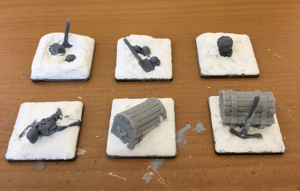 The skeletal pieces came from the Oathmark skeleton kit, with a bit of clipping here and there to remove bows and arrows from hands, and the tools from the Oathmark Dwarf Light Infantry. I've had the chests knocking around for a while - I think they're from the Massive Darkness board game. The relic is from a Plague Monks sprue - this is the second time I've used it as a marker (the first being my original Frostgrave treasure tokens - seen here).